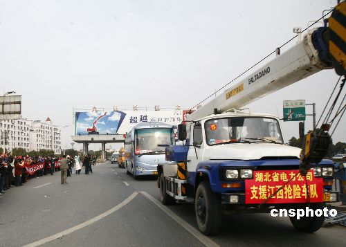 2月10日上午11時許,由171輛車組成的湖北支援江西電網(wǎng)的搶修車隊通過九江長江大橋抵達江西,搶修人員將趕赴咸夢線的搶修工地,修復(fù)咸夢線江西段134公里長受損電網(wǎng)。中新社發(fā) shendudu 攝