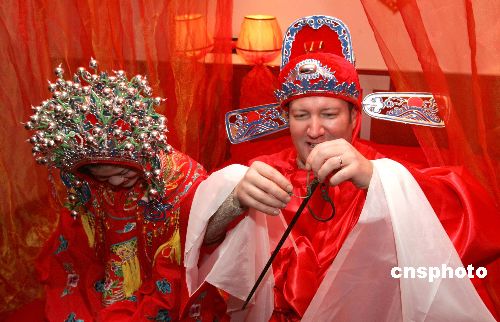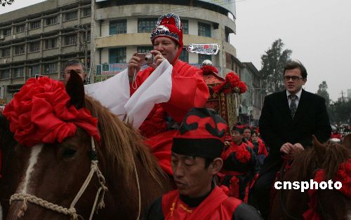 春節(jié)期間,福建省平潭縣城的一支老外娶親隊(duì)讓大街小巷沸騰了起來,娶親的法國人史蒂文按正宗的中國傳統(tǒng)婚俗迎娶平潭新娘。這對新人是一九九九年在廣州廣交會上認(rèn)識,經(jīng)歷了近十年愛情長跑才走到了這一天。中新社發(fā) 小小 攝