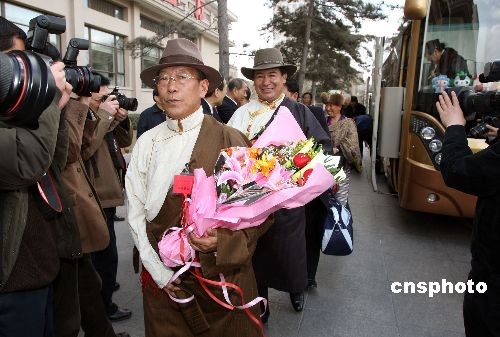 3月2日,出席十一屆全國人大一次會議的西藏代表團(tuán)抵達(dá)駐地北京京西賓館,受到熱烈歡迎。前者為新雜·單增曲折代表(西藏自治區(qū)人大副主任),后者是多吉次珠代表(拉薩市市長)。中新社發(fā) 任晨鳴 攝
