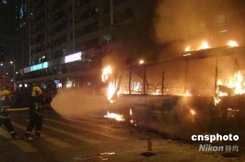 四月九日晚二十一時(shí)三十分許,重慶市區(qū)一輛載有十余名乘客的公交車在行進(jìn)中起火燃燒。消防人員迅速趕到現(xiàn)場撲救,由于乘客疏散及時(shí),未造成人員傷亡。出事公交車燒得面目全非,起火原因在進(jìn)一步調(diào)查中。中新社發(fā) 萬明 攝