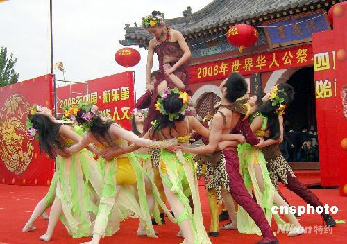 22日,第四屆伏羲文化旅游節(jié)在“羲皇圣里”河北省新樂市開幕。來自美國、加拿大、臺灣、香港等國家和地區(qū)的萬余名華人代表、學(xué)術(shù)社團代表、伏羲文化專家、易學(xué)專家、各地客商及當?shù)孛癖婟R聚“伏羲臺”,舉行2008年世界華人公祭人文始祖伏羲大典。新樂自古有“羲皇圣里”之稱,商周以來,這里就是世界華裔同胞尋根祭祖的圣地,每年陰歷三月十八的伏羲廟會,香火鼎盛,連綿不絕,延續(xù)至今。圖為祭祀大典當中的樂舞告祭。中新社發(fā) 牛琳 攝