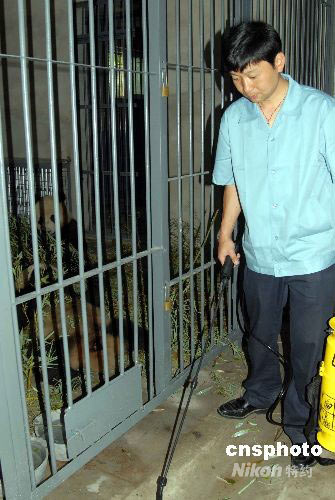 圖:北京動物園對臥龍奧運大熊貓圈舍消毒