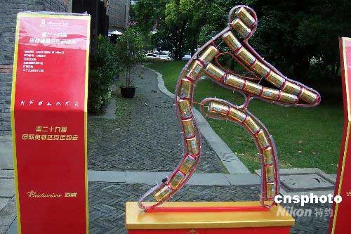 6月14日,一組用易拉罐組成的雕塑亮相上海新天地。雕塑展現(xiàn)了從1896年4月6日在希臘雅典召開的第一屆現(xiàn)代奧運會到2008年8月8日將在中國北京舉行的第29屆奧林匹克運動會的體育項目。中新社發(fā) 周東潮 攝