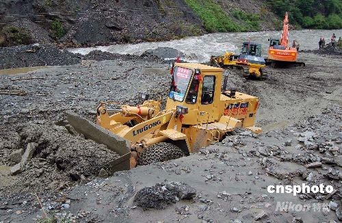 因近日連續(xù)暴雨,前不久剛剛搶通的5·12大地震重災(zāi)區(qū)臥龍至耿達(dá)的簡易公路多處被泥石流、坍方?jīng)_斷,武警交通直屬工程部緊急出動(dòng)工程機(jī)械搶通。圖為裝載機(jī)在一處厚達(dá)3米多、寬近300米的泥石流堆積層上為后續(xù)機(jī)械開出一條通路。中新社發(fā) 江湖 攝