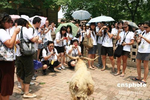 7月7日,由海外18個(gè)國(guó)家和地區(qū)的243名優(yōu)秀華人子弟組成的“第九屆海外杰青匯中華訪問(wèn)團(tuán)”來(lái)到陜西楊凌,參觀了西北農(nóng)林科技大學(xué)國(guó)家重點(diǎn)實(shí)驗(yàn)室----人工模擬降雨大廳和該校培育的世界首批成年體細(xì)胞克隆山羊“陽(yáng)陽(yáng)”以及世界上最大的胚胎克隆羊群體。據(jù)了解,“海外杰青匯中華” 訪問(wèn)團(tuán)是以幫助海外華裔大學(xué)生“了解現(xiàn)代中國(guó) 認(rèn)識(shí)文化根源”為宗旨的活動(dòng)。訪問(wèn)團(tuán)除了在陜西參觀后還將赴北京、天津和上海等地參觀。 中新社發(fā) 支勇平 攝