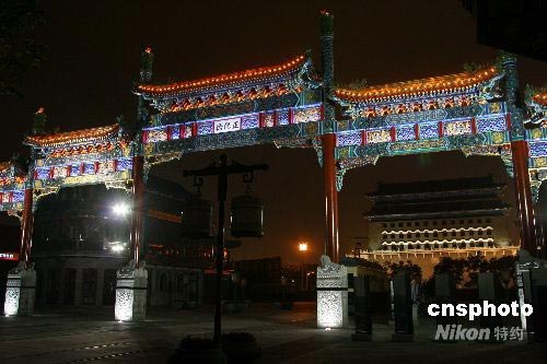 7月8日晚,前門大街北端的五牌樓“亮燈”調(diào)試,燈光映襯下,大氣恢宏的五牌樓成為市民駐足觀賞的夜景。據(jù)了解,前門大街基本修繕完工,各項功能性設(shè)施都已進(jìn)入調(diào)試完善階段,其中包括五牌樓的夜景照明系統(tǒng)。中新社發(fā) 富田 攝