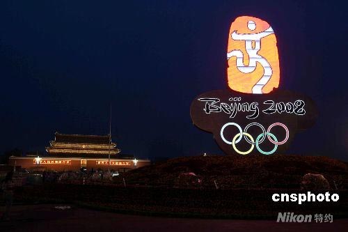 7月28日,天安門廣場迎接奧運(yùn)會花卉景觀制作工作進(jìn)入最后收尾階段,用鮮花裝點(diǎn)的“中國印”彩燈在晚上點(diǎn)亮,喜迎北京奧運(yùn)會。 中新社發(fā) 富田 攝
