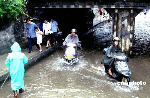 7月29日,受臺(tái)風(fēng)“鳳凰”帶來(lái)強(qiáng)降雨的影響,福州一低洼地帶積水仍未退去,為市民出行帶來(lái)不便。中新社發(fā) 劉可耕 攝