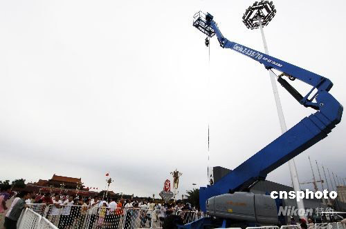 7月29日,美國(guó)一家電視臺(tái)動(dòng)用云梯空中拍攝天安門廣場(chǎng)迎奧運(yùn)盛況。據(jù)報(bào)道,北京在奧運(yùn)會(huì)期間對(duì)天安門廣場(chǎng)上的直播報(bào)道亮起綠燈,不過僅限于獲得奧運(yùn)轉(zhuǎn)播權(quán)的官方電視公司。根據(jù)相關(guān)協(xié)議,外媒直播報(bào)道時(shí)段被安排在早上6點(diǎn)到10點(diǎn)以及晚上9點(diǎn)到11點(diǎn)。其他媒體也可以在天安門廣場(chǎng)進(jìn)行報(bào)道,但不能直播。 中新社發(fā) 王東明 攝