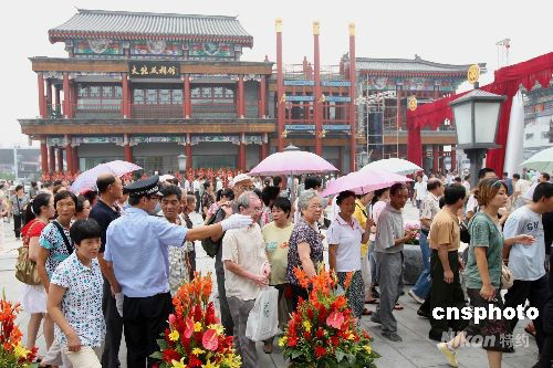 8月7日,眾多北京市民及外地游客在警察的疏導(dǎo)下,有次序地參觀(guān)改造后的北京前門(mén)大街。當(dāng)日,北京前門(mén)大街正式對(duì)外開(kāi)放。經(jīng)過(guò)2年多的擴(kuò)建、改造,老牌樓、有軌電車(chē)、老字號(hào)店鋪重現(xiàn)老北京時(shí)的風(fēng)貌。中新社發(fā) 史利 攝