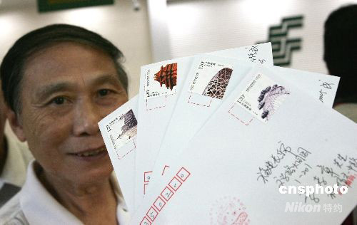 八月二十四日上午,北京奧運(yùn)會(huì)最后一天,一位老伯在福州市郵電大樓高興地拿著剛買到的《奧運(yùn)會(huì)從北京到倫敦》紀(jì)念郵票!秺W運(yùn)會(huì)從北京到倫敦》紀(jì)念郵票,由中國國家郵政局和英國郵政聯(lián)合發(fā)行。 中新社發(fā) 楊婀娜 攝