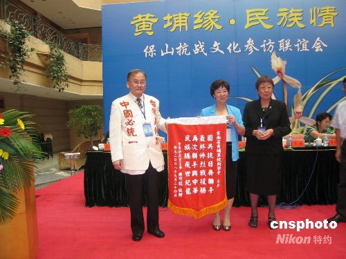 圖為臺(tái)灣中華新黨主席樂(lè)可銘(左一)向云南省黃埔軍校同學(xué)會(huì)秘書(shū)長(zhǎng)李俊平(左二)贈(zèng)送錦旗。