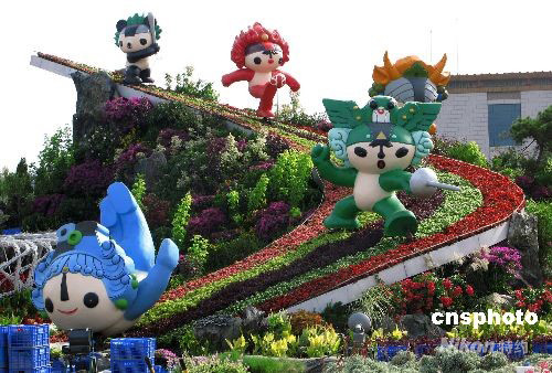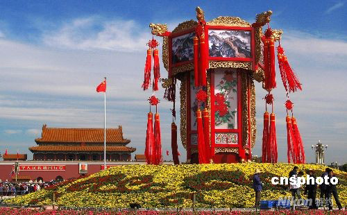 9月25日,北京天安門廣場(chǎng)“普天同慶”繁花錦簇的十一國慶花壇布置工程進(jìn)入了最后收尾階段。廣場(chǎng)東側(cè)的5個(gè)福娃花壇與中央9.9米高的民族傳統(tǒng)宮燈花壇相映成趣。中新社發(fā) 鄒憲 攝