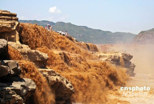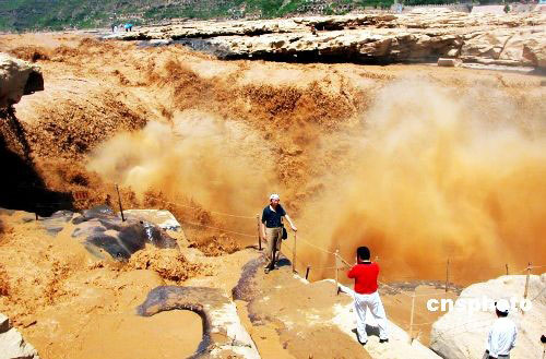 2008年10月1日,游人在黃河壺口處游覽,拍照留念。位于陜西宜川縣和山西吉縣交界處的黃河壺口瀑布,有“天下黃河一壺收”之譽,主瀑布寬約40米左右,落差40米以上,今年上游來水量增加,壺口瀑布流量隨之增加,“十一”黃金周吸引了眾多游客。中新社發(fā) 沙漠 攝