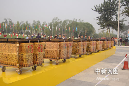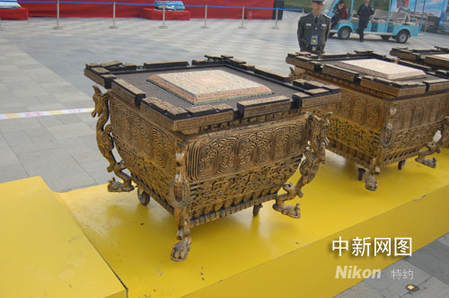 奧運開幕式道具—缶在北京朝陽國際旅游文化節(jié)上亮相,吸引游客駐足觀賞。張濛 攝