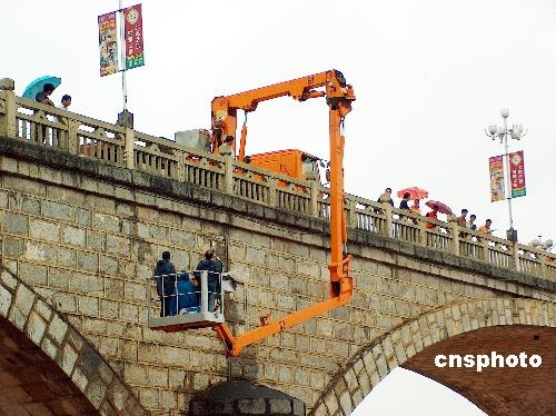 11月2日上午,廣西南寧公路局工程技術(shù)人員冒細(xì)雨為中國(guó)當(dāng)代最長(zhǎng)的石拱橋——--龍州大橋“把脈探傷”。龍州大橋建于上世紀(jì)60年代,為七拱方塊石料結(jié)構(gòu),橋長(zhǎng)約252米。在通車的43年來(lái),已經(jīng)受了4次大洪水的考驗(yàn)。中新社發(fā) 馮文 攝