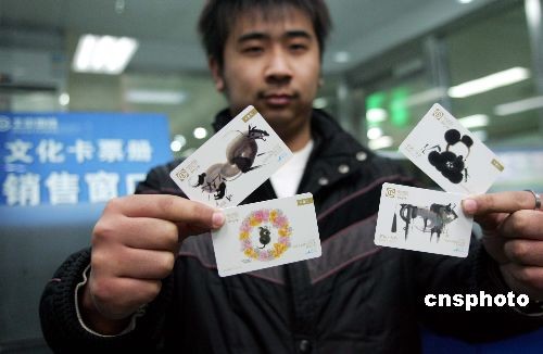 12月6日,北京市地鐵運營公司開始發(fā)行4000冊紀念文化卡票,每冊280元,這是北京軌道交通運營38年來首次發(fā)行紀念文化卡票。除機場線4個站外,北京地鐵7條線的119個站點將同時發(fā)售紀念卡票。紀念卡票特邀韓美林擔綱設計,冊內收藏北京地鐵紀念文化卡票4張,設計以“奧運與地鐵”文化創(chuàng)意為主線,選農歷戊子年“鼠”為首頁,以“熊貓、耕牛、駿馬”為圖,分別呈現(xiàn)“和諧、平安、耕耘、開拓”。中新社發(fā) 富田 攝