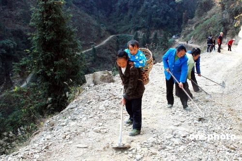 12月15日,湖北恩施市新塘鄉(xiāng)河溪村一土家山寨幾十名山民利用冬閑忙修路。據(jù)了解,山寨四面環(huán)山,交通閉塞,山民出行十分不便。山寨有47戶(hù)人家,一百多人口,而且青壯年大多都背井離鄉(xiāng)外出打工。當(dāng)?shù)赜袆趧?dòng)能力的婦女、小孩和老人紛紛上山修路;除由政府出資外,當(dāng)?shù)厣矫襁自籌資金修路。目前已修通公路6.73公里。中新社發(fā) 陳地長(zhǎng) 攝