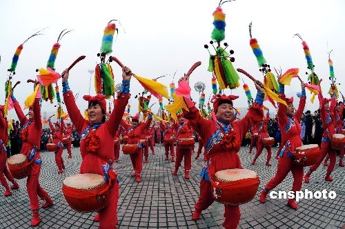 2月10日,在有“天下第一鼓”美稱的河北藁城市,上萬名當(dāng)?shù)厥忻癜选皯?zhàn)鼓”搬到了廣場上,擊鼓狂歡慶新春。中新社發(fā) 鮑榮華 攝