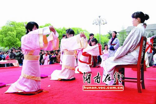 漢民族的女子成人禮又稱“笄禮”。3名少女在司儀的指引下,先在銅盆中凈手,再將長發(fā)梳發(fā)髻插入發(fā)簪,隨后起身加上一件外衣,向親人行叩拜大禮,再喝完禮酒,同樣的步驟重復(fù)3遍才算結(jié)束,歷時1個小時。