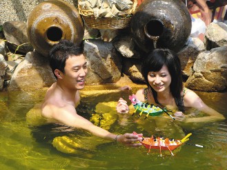 昨天推出的“雄黃酒湯”,在溫泉里加入適量的雄黃酒。據(jù)介紹,雄黃酒含有三硫化砷,不可多喝,但用來(lái)泡澡凈身,可以消除疫病,溫泉池畔放了一壺雄黃酒,游客還可以沿襲傳統(tǒng),用手指或毛筆沾酒,在額頭寫(xiě)一個(gè)“王”字,體驗(yàn)古代人驅(qū)邪的儀式。