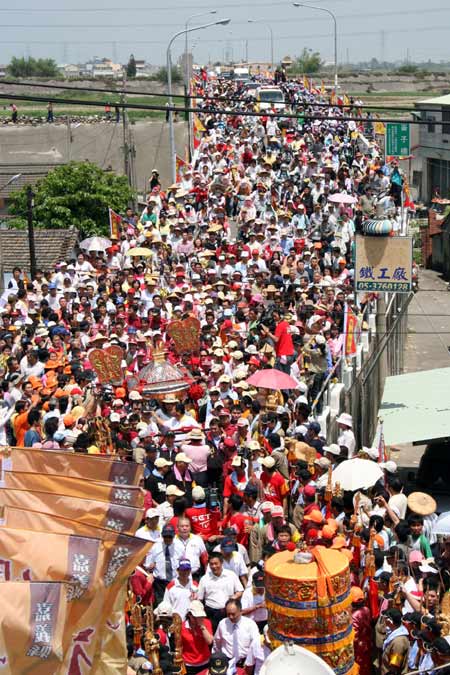 大甲媽祖繞境進(jìn)香隊(duì)伍八日中午抵達(dá)目的地嘉義縣新港鄉(xiāng),數(shù)以萬(wàn)計(jì)的信眾,擠滿云嘉交界的侖仔大橋。 “中央社”圖