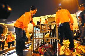 廣州日?qǐng)?bào)10月28日?qǐng)?bào)道 23時(shí)58分,第一批兩只熊貓寶寶津柯和博斯同時(shí)被運(yùn)下飛機(jī),2分鐘后就被裝上了前來(lái)迎接它們的車(chē)輛。其余4只熊貓?jiān)诘诙黄鹣铝孙w機(jī),所有熊貓寶寶在今日凌晨0時(shí)10分裝車(chē)完成,被送往香江野生動(dòng)物園。