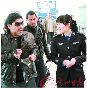 昨天上午9時,馬拉多納乘坐的德國漢莎航空公司航班抵達首都國際機場3號航站樓,約一個小時后,馬拉多納出現(xiàn)在眾人的視線內(nèi)。他一改南非世界杯上西裝革履的打扮,身著黑夾克、戴著墨鏡,顯得精神矍鑠。阿根廷“球王”熱情地和現(xiàn)場的歡迎者打招呼,隨后手捧一束紅玫瑰,登上了機場的擺渡車進入貴賓休息室,并在那里舉行了簡短的新聞發(fā)布會。馬拉多納說:“我剛剛過了50歲生日,我感到非常高興,也非常幸福。我是一個熱愛家庭的人,我會把我的全部都貢獻給我的家庭!瘪R拉多納也對中國足球表示了祝福,他:“在足球領域,中國是沉睡的雄獅,我相信有一天中國足球必然會騰飛。”