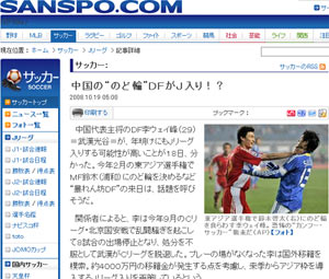 李瑋鋒即將加盟日本J聯(lián)賽的消息最早見諸于17日的日本雅虎體育。當(dāng)時(shí),雅虎體育就以“功夫足球?qū)⒌顷懭毡?”為題,曝出了中國國家隊(duì)主力李瑋鋒即有可能在明年初加盟J聯(lián)賽,并稱李瑋鋒“作為最強(qiáng)最兇悍的后衛(wèi),堪稱中國功夫足球的代名詞”。19日,日本產(chǎn)經(jīng)體育等多家媒體進(jìn)一步證實(shí)了這一消息,并稱“動(dòng)粗小子”李瑋鋒的到來不 啻為一場“恐怖襲擊”。