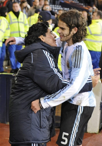 圖為馬拉多納與阿根廷球員加戈擁抱,相慶勝利。