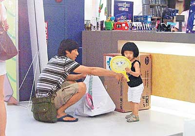 12日傍晚記者目擊陶子一家人步出家門,李李仁體貼先幫她開車門,等她坐穩(wěn)再讓小荳荳上車,安頓好后車子開向信義區(qū)“紐約紐約”購物中心,他們先直沖玩具城,小荳荳興奮到處找玩具,陶子出聲制止,李李仁讓女兒試騎一臺價(jià)值近萬元新臺幣的玩具車,夫妻倆二話不說直接埋單。