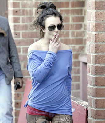 布蘭妮一點都不在乎自己的形象,不但衣服的下擺撕裂,還穿著帶破洞的漁網(wǎng)絲襪,露肩裝也過于暴露。下面只穿了一件紅色超短褲,短得不能再短。