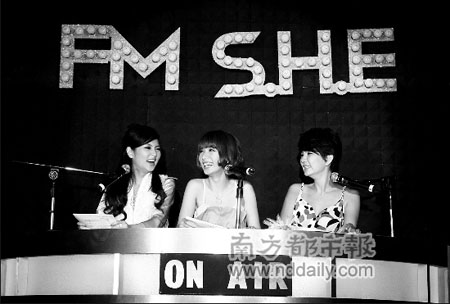 距離上一張《PLAY》專輯已經(jīng)過了將近1年半,即使唱片市場(chǎng)越來越不景氣,但《FMS.H.E》的臺(tái)灣預(yù)購量還是沖到了4.2萬張,讓S.H.E又驚又喜。前日在重金打造的豪華旋轉(zhuǎn)DJ臺(tái)上,身著美麗小禮服的S.H.E三人,不僅聲音悅耳,身材也讓大家驚艷,可惜播報(bào)新聞時(shí)輪流吃了幾次螺絲,把嚴(yán)肅的新聞報(bào)得笑果十足(見右圖)。事后她們?nèi)滩蛔舌?“舞臺(tái)正前方的聚光燈太強(qiáng)了啦,讓我們看不清楚稿子,平常錄電臺(tái)節(jié)目時(shí),并不會(huì)這樣的嘛!