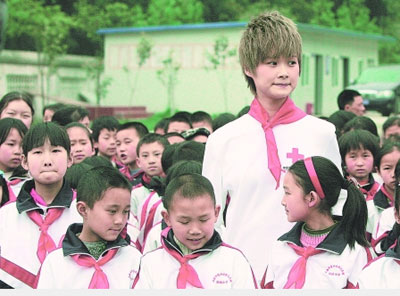 稍后,海虹小學(xué)的所有學(xué)生都在操場(chǎng)上集合,春春身邊的小朋友從7、8個(gè)增加到100多個(gè)。人一多,場(chǎng)面就不好控制,這邊的孩子剛排好隊(duì),那邊就有人咳嗽,要不就是忘記面帶微笑。李宇春和孩子們熟悉起來(lái),還鼓勵(lì)他們笑起來(lái),“只要我們持續(xù)關(guān)愛四川,就會(huì)萬(wàn)物復(fù)蘇,奇跡來(lái)臨……”全場(chǎng)一起喊出最后的話:“四川依然美麗,中國(guó)更加美麗!”小朋友們和這位大姐姐一起面對(duì)鏡頭揮手,現(xiàn)場(chǎng)氣氛達(dá)到了最高潮。